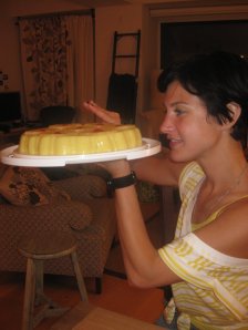 I made this Pina Colada jello mold for Rebecca‘s birthday party. It is pineapple Jello with coconut milk and spiced rum, topped with pineapple slices and maraschino cherries. I was a little worried that it would be gross but it was absolutely yummy and a total hit! (So much so that during the party while I was up on the roof people where downstairs having their portraits made with the jello. Thanks Handel!)
