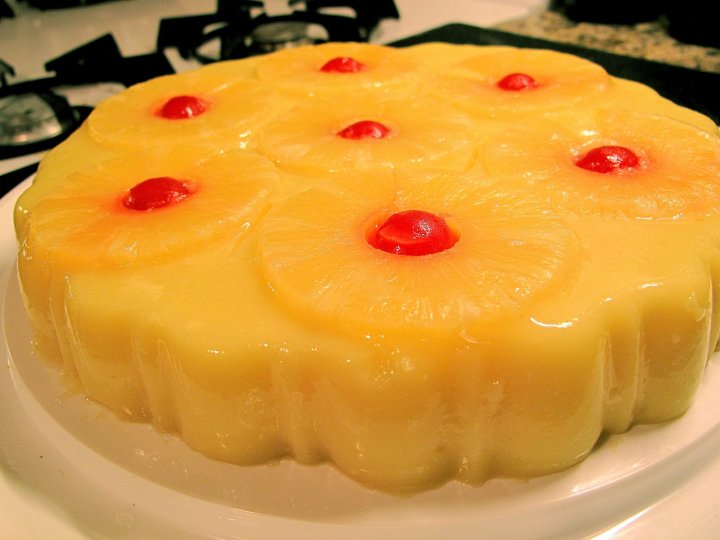 Meanwhile, drain canned pineapple slices and press some of the moisture out between two paper towels. Arrange in a formation in the bottom of a 4-cup mold or pineapple upside down dish. Place a cherry half in the center of each pineapple ring, cut side up.