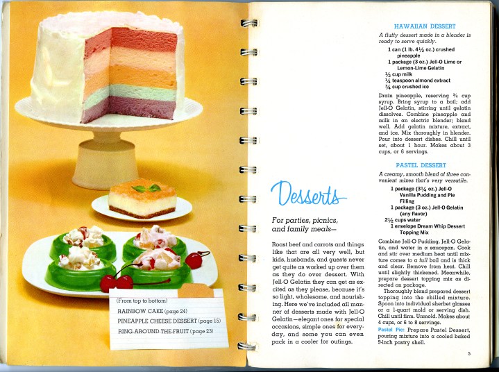 […] to try a recipe from it. The New Joys of Jell-O, a 1973 follow-up to the original 1960′s Joys of Jell-O, takes jello from the suburbs to the city and features photographs of sophisticated, swinging, […]