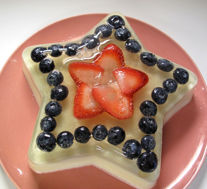 For the holiday weekend I made this festive star-shaped mold with blueberries and strawberries set in a layer of clear gelatin. The white base layer is Guanabana flavored gelatin brought back for me from Mexico by Art. (More exotic Mexican flavors to follow). The flavor was fruity and refreshing, perfect for the very hot weekend. Happy 4th of July!