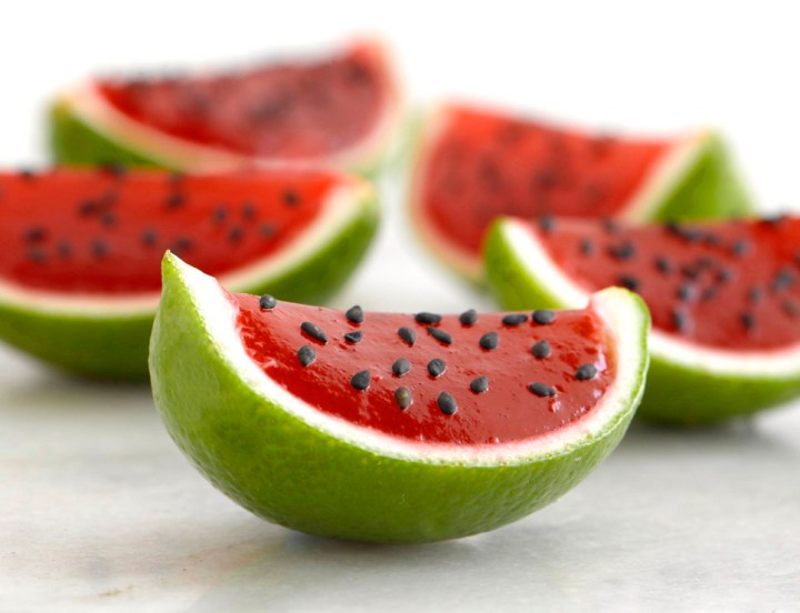 With the passing of the Labor Day weekend and summer drawing to an end, I made these mini watermelons to commemorate the occasion. Made with lime rinds, strawberries, and vodka with little black sesame seeds, these make fun little “jello shots”.  I have seen versions of this all over the web, most recently and notably on another jello blog called My Jello Americans. This is just one of an amazing array of tiny “jello shots” from the creators of that blog made with their own infused liquors in fun, creative shapes. The recipe for this can be found in a preview of my new book here.