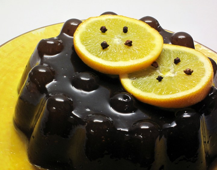 Inspired by my friend Sydney‘s yearly holiday party tradition of brewing up some yummy hot wassail punch, spiked with dark rum, comes this cold, gelatinous version of the delicious treat. Its made with apple and cranberry juice, slow simmered with allspice, cloves and an orange. Of course rum is added before it goes in the fridge for cooling and solidifying. This jello mold will be served up at Syd’s holiday party this week and I look forward to seeing how it stands up to its liquid counterpart. This holiday recipe is another that will appear in my forthcoming book.