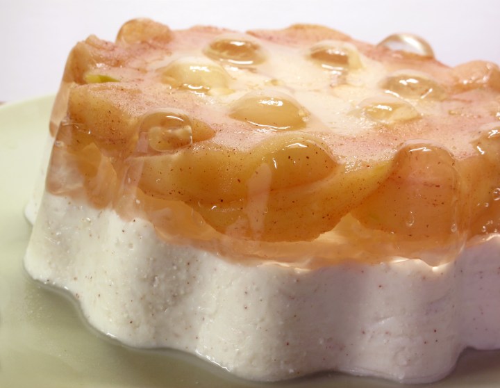 Flavor Tripping parties have been growing in popularity over the last several years and I finally got invited to one. The idea behind these parties is that one consumes Miracle Fruit, a berry that makes sour, spicy, and some savory foods taste sweet (for about an hour), and then sucks on lemons and pours tabasco sauce all over their tongue to experience the unfamiliar flavor sensations (and wakes up the next morning with chapped lips and a tummy ache). I wanted to make a jello for the occasion but didn’t want to go with the obvious choice and make a really sour lemon or lime jello that, with the miracle fruit, would just taste like, well, jello. So upon more research I decided upon sour apples and goat cheese. I stewed tart granny smith apples in cinnamon with slightly sweetened plain gelatin for the top layer, and softened goat cheese mixed with a small amount of cinnamon and sugar on the bottom layer. On its own it was quite tasty, although a little more sweetness would have brought out the flavor. But with the miracle fruit the result was sweet, buttery, Apple Pie!