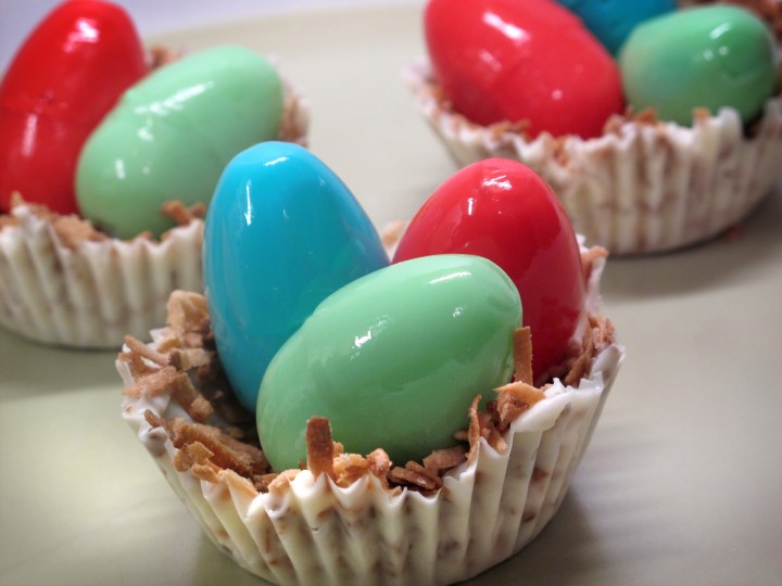 For the nests: Toast coconut flakes by spreading coconut on a baking sheet and baking in a preheated 350 degree oven, stirring occasionally, for 8 minutes being careful not to let the coconut burn. (You can do this at any point before beginning the recipe as the coconut need not be warm when adding it to the white chocolate “nests”.) In a small saucepan, heat chocolate and shortening until melted stirring well. Using the back of a spoon spread the chocolate evenly inside of jumbo size foil muffin liners. Sprinkle toasted coconut flakes into the chocolate cups, gently pressing some of the flakes into the sides of the cups so they stick. Refrigerate until firm, about 30 minutes. Carefully peel away foil. Place Jell-O eggs inside the nests just before serving.