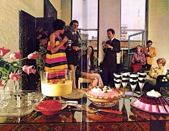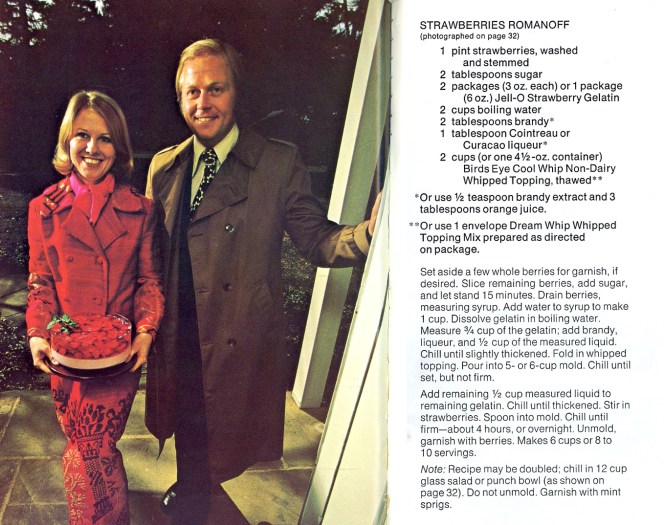 My sister Kateri sent me this recipe book some time ago and I have been meaning to try a recipe from it. The New Joys of Jell-O, a 1973 follow-up to the original 1960’s Joys of Jell-O, takes jello from the suburbs to the city and features photographs of sophisticated, swinging, singles in a posh Manhattan penthouse feasting on a dizzying array of jello selections… Seems about right.