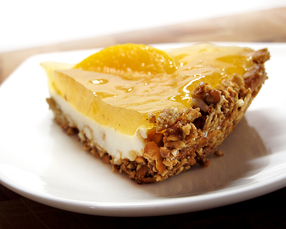Sweet and salty deserts are all the rage, and while you may not think to combine such flavors the outcome is really quite amazing. A little saltiness from the crunchy pretzel crust of this pie really brings out the sweet flavor of the peaches with a cool layer of creamy cheese in the middle. The peach layer, made with peach nectar rather than preflavored peach gelatin, is velvety and delicious with a dash of cinnamon and honey to give it a little spice. I wrote this recipe especially for the Cooking Channel where you can find the recipe complete with process photos.