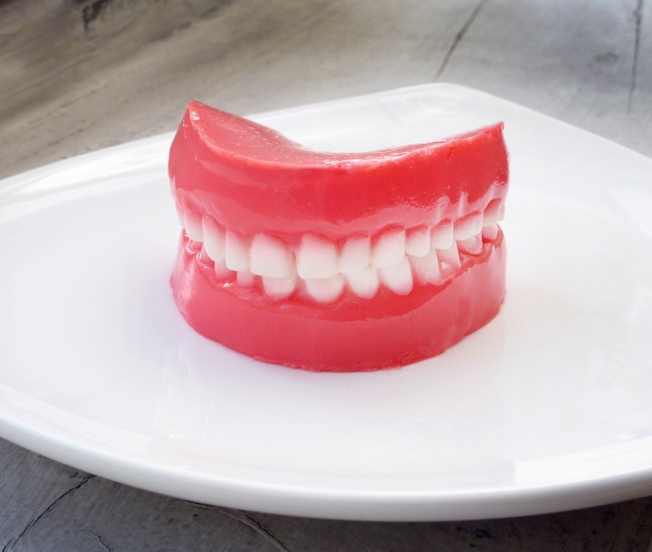 To unmold gently peel the gelatin out of the mold. It should come out somewhat easily because of the cooking spray. Stack one set of dentures on top of the other and serve.