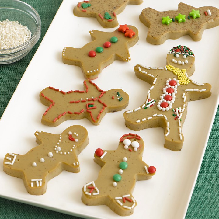 Dip the bottom of the baking sheet in warm water for 15 seconds to loosen gelatin. Use gingerbread man cookie cutters to cut the gelatin into shapes and lift from the pan. Decorate and serve.