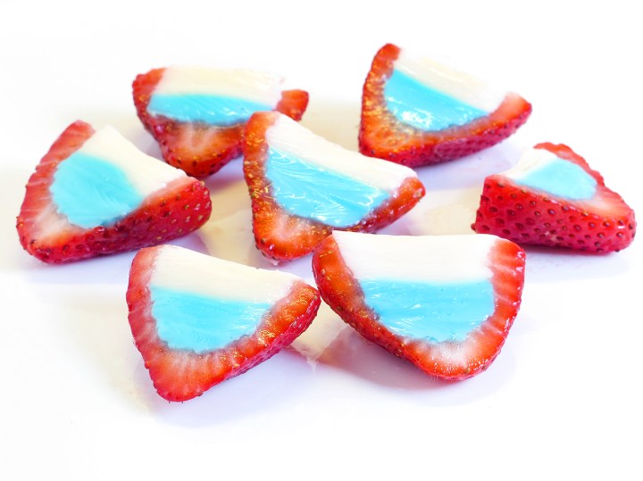 Spoon the white mixture into the strawberries over the blue. Refrigerate overnight until firm. Carefully cut the gelatin filled strawberries in half lengthwise and serve.