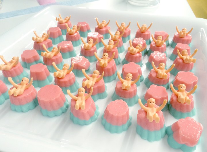 What goes better with office workers and babies-to-be but pink and blue jello shots? These were made especially for a surprise office baby shower for a couple of coworkers each having a baby, one boy and one girl. Watermelon flavored with creamy condensed milk and topped with little plastic babies, these were the highlight of the surprise and only a little creepy.