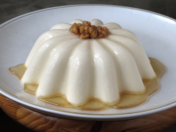 In a tiny saucepan, heat the honey and water until the honey melts into the water. Remove from heat and pour into a separate container. Allow to cool to room temperature and stir in the walnuts.Unmold the custard, pour the honey and walnuts over it, and serve.