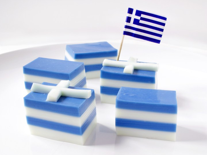 Dip the pan in warm (not hot) for 10 to 15 seconds to loosen the gelatin. Cut into rectangles. If you’re feeling ambitious, cut strips of white from the trimming at the edge of the pan to make the white crosses of the Greek flag on the top of the pieces. And serve.