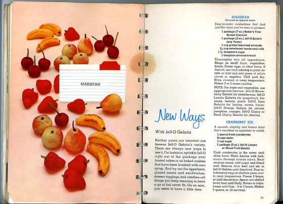 This nifty recipe book was sent to me by a reader who found it in the depths of his parent’s house in Nebraska. Each page features a different meat dish with a suggestion for a proper gelatin salad pairing. If the primary suggestion is not to your liking a wheel can be turned at the […]